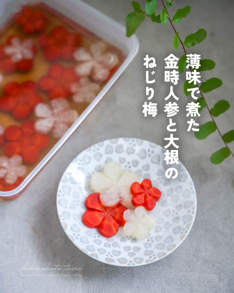 食べられる飾り◎薄味で煮た金時人参と大根のねじり梅と、今日のお正月準備。